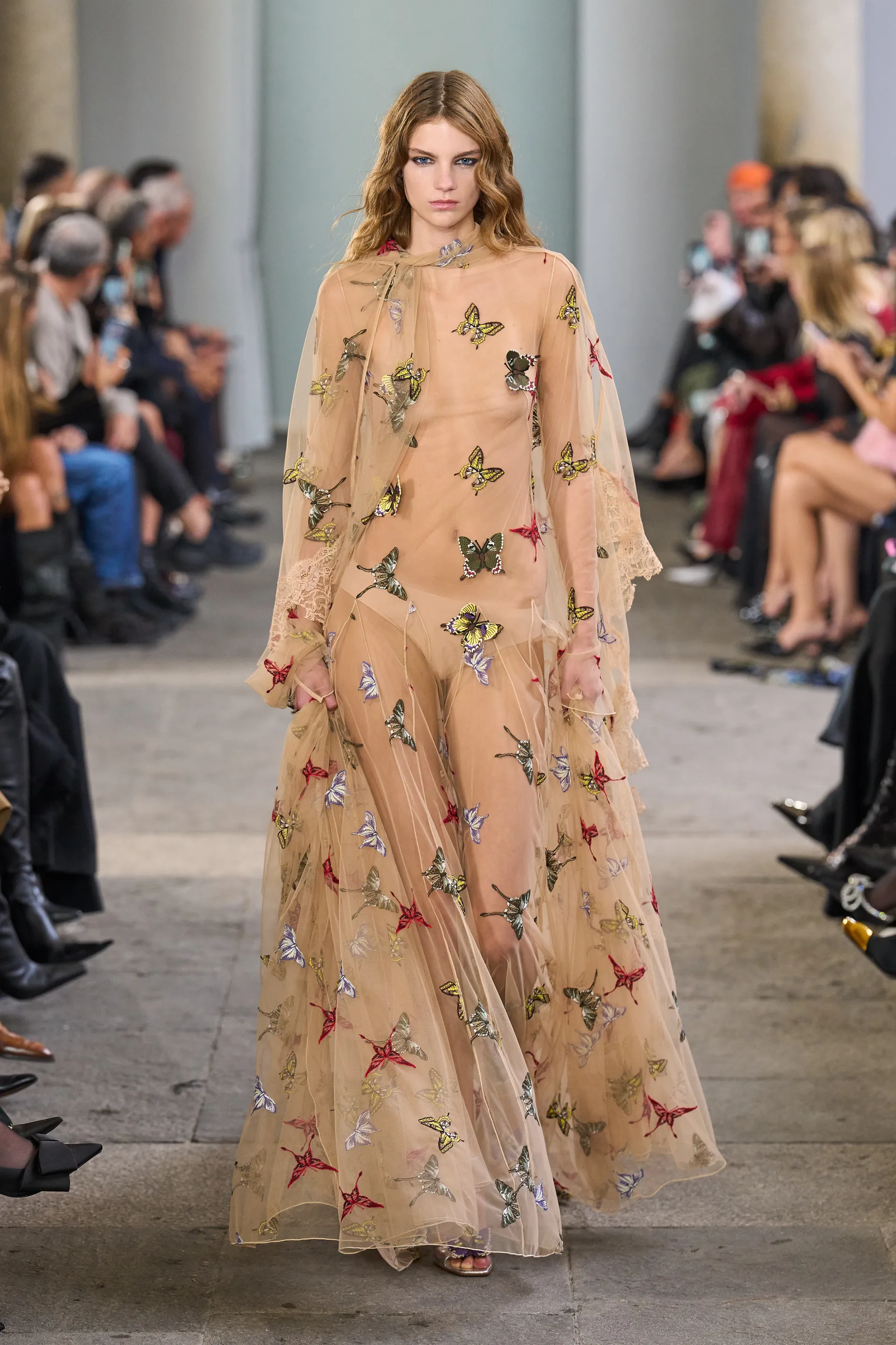 The early 2000s butterfly obsession fluttered back to life with a moody twist in Blumarine’s collection. Delicate butterfly appliqués adorned sheer, gauzy dresses that floated effortlessly down the catwalk, evoking a dreamy fairy-core vibe tinged with Victorian Gothic romance. The collection’s signature details of ruching, frayed edges, soft plissé textures, and intricate macramé accents added tactile richness and a sense of handcrafted artistry. This blend of ethereal lightness and dark romanticism gave the butterfly motif a fresh, complex energy, transforming it from nostalgic whimsy into a statement of rebellious femininity for the new season.
