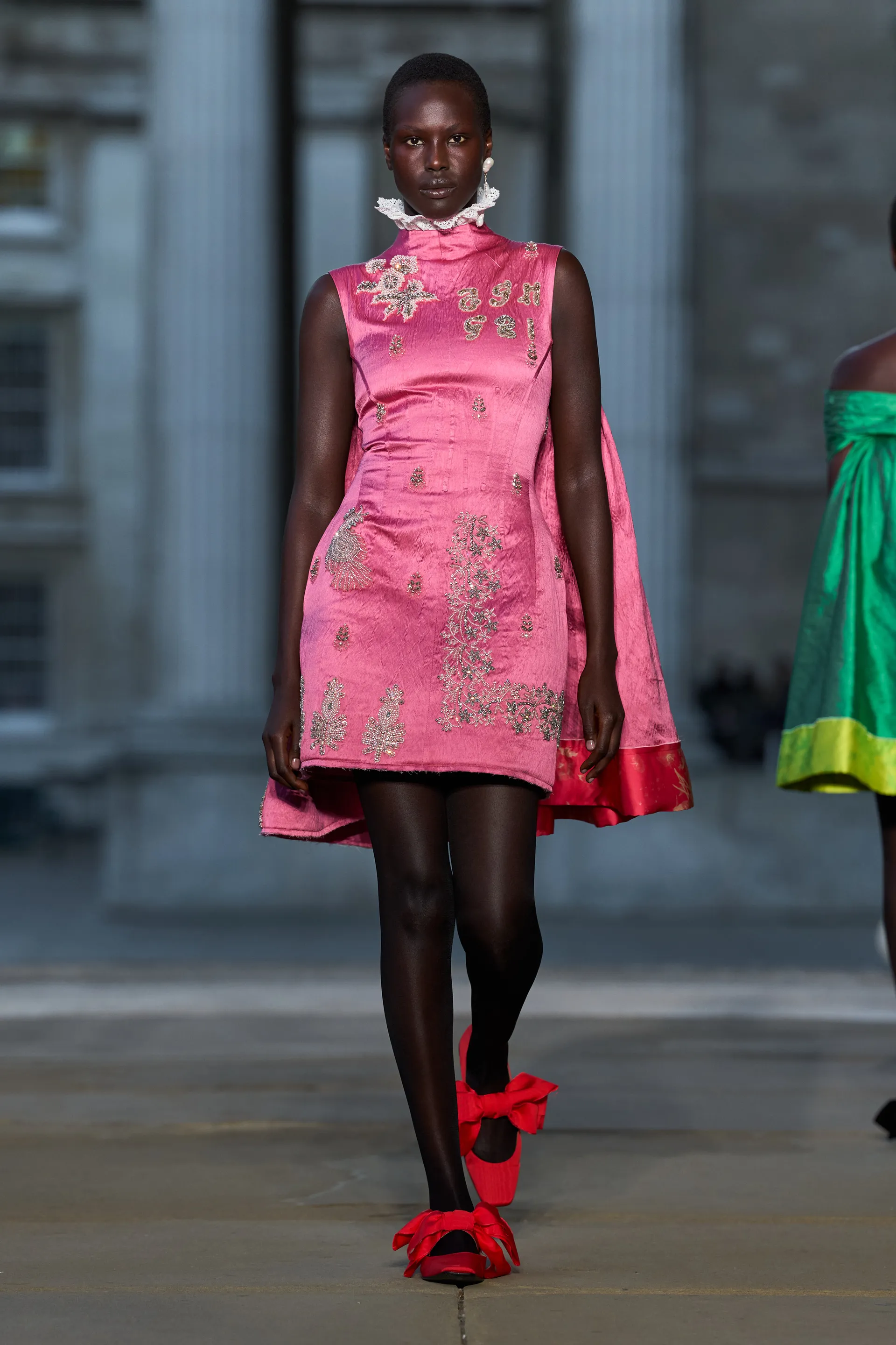 At the forefront of the micro-motif trend, Erdem captivated the S/S 2026 runway with hip-molded antique lace dresses adorned with an array of embroidered botanicals in vibrant pinks and greens. These intricate motifs cascaded gracefully down the sides of voluminous 18th-century-inspired silhouettes, merging historical grandeur with contemporary flair. The embroidery possessed an almost hand-painted quality, offering a fresh reinterpretation of traditional floral patterns. Notably, several silk gowns were embellished with embroidered crystals arranged in motifs evocative of classic East Indian designs, seamlessly blending global influences with Erdem’s signature romanticism. This fusion of detailed craftsmanship and bold color brought a richly textured dimension to the collection, celebrating both heritage and innovation.